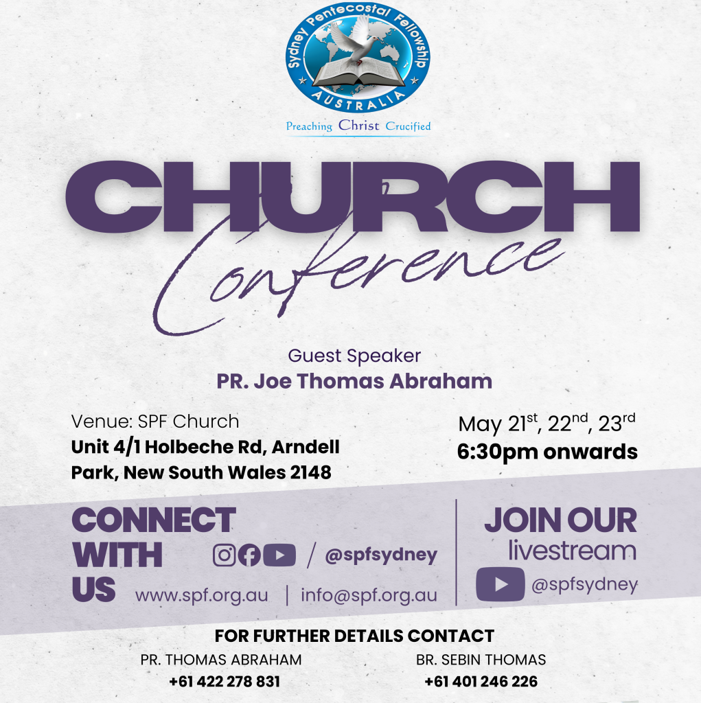 Join us for our SPF annual conference which will be an amazing time for you to encounter God, be filled with his holy spirit and hear from amazing preachers and worship together as one body in Christ. Preacher: Joe Thomas Abraham May 21st to May 23rd 2026 6:30pm Onwards Location: Unit 4/1 Holbeche Rd, Arndell […]